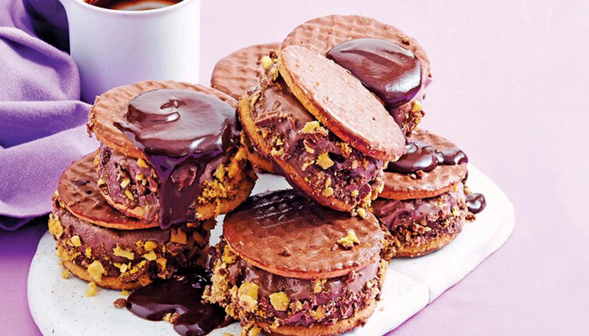 An elegant ice-cream dessert that is heightened by the textural element of buttery, digestive biscuits and chopped up Crunchie bars.