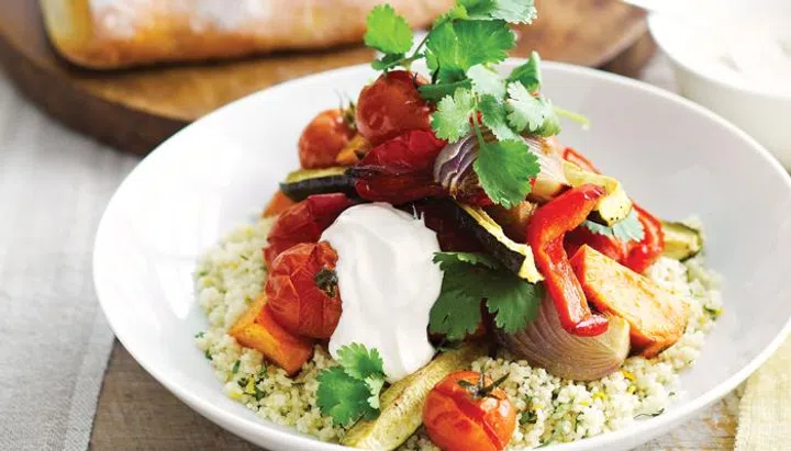 This wholesome dish of roasted vegetables with couscous and spiced yoghurt will leave you feeling healthy and satiated.