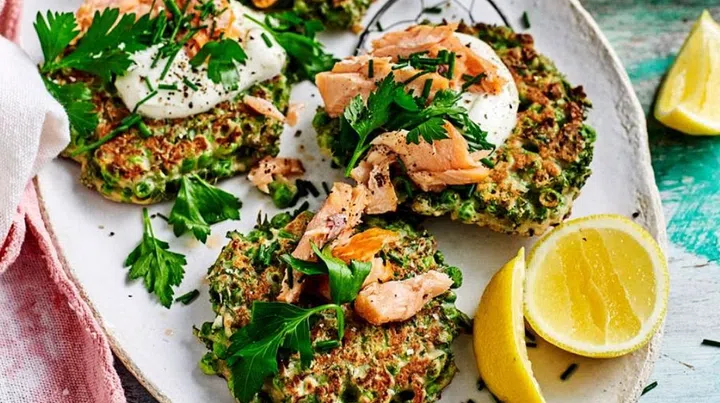 Packing our greens into a pancake never fails to deliver for it retains its flavour and nutrition while being served in style. Suitable for entertaining and lunch boxes, these pea and kale fritters are overlaid with smoked salmon for a hearty plate.