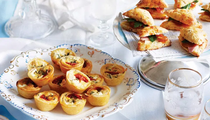 Please your guests with mini tomato goat's cheese thyme quiches.