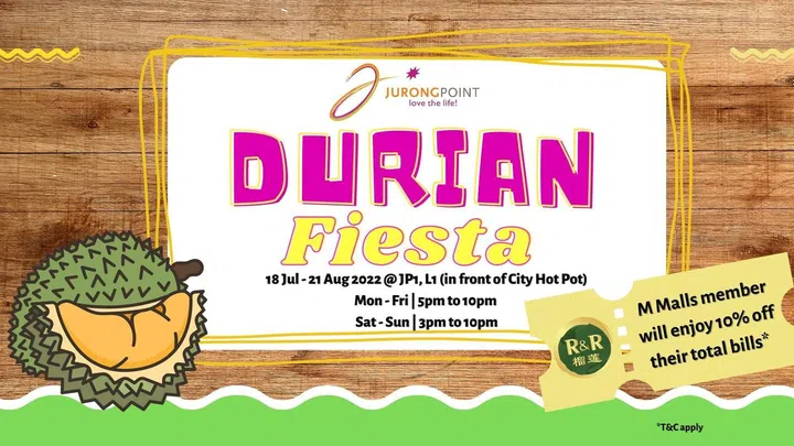 Jurong Point has rolled out a Durian Fiesta, and for 60 minutes, you can dine on a free-flow of durians every Tues and Thurs, from now till Aug 21, 2022. You have the choice of the luscious D24 at $38 per adult, or the covetable Mao Shan Wang (Musang King), priced at $88 per adults. Mineral water will be provided at the event.