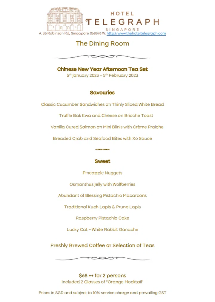 Available from now till Feb 5, 2023. The Dining Room at Hotel Telegraph. $68++ for two persons, including two glasses of orange mocktail.