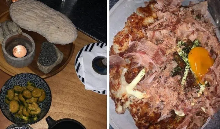 THE SIGNATURE DISH: A full-course round of Kyuri, Sari Gowari Morohaku Sake and Okonomiyaki KD from Katong Diner.