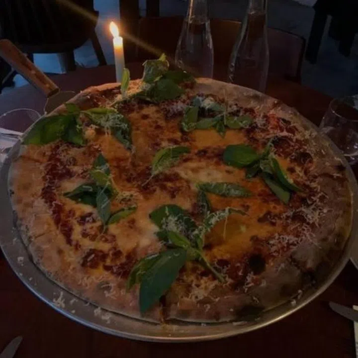 THE SIGNATURE DISH: The Original 18” Pie done New York-style with buffalo mozarella, mozarella, parmesan, basil and optional roasted garlic from Lucali BYGB.