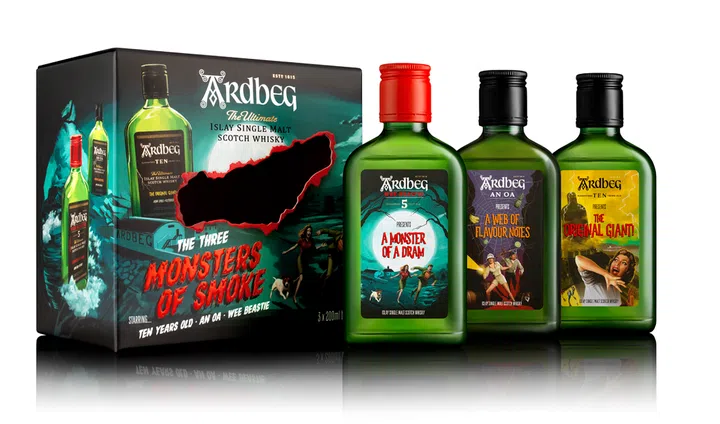 Celebrate the spooky season from home with Islay malt whisky brand ARDBEG's Monsters of Smoke trio pack, perfect for whisky fans who are new to smoky malts. Drawing on the world of 1950s B-movie horror, the collectible bottles sport a label that can be peeled to reveal the unique artworks lurking beneath.