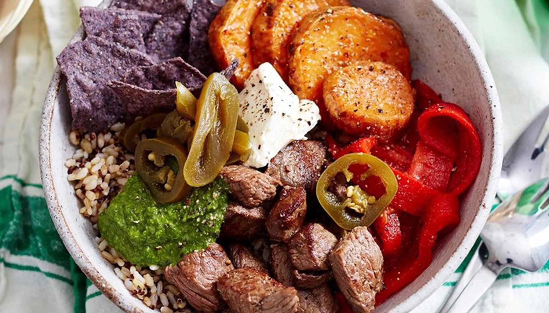 06. Serve brown rice and quinoa topped with beef, sweet potato, capsicum and chimichurri. Accompany with blue corn chips, sour cream and slice jalepeno, if liked.