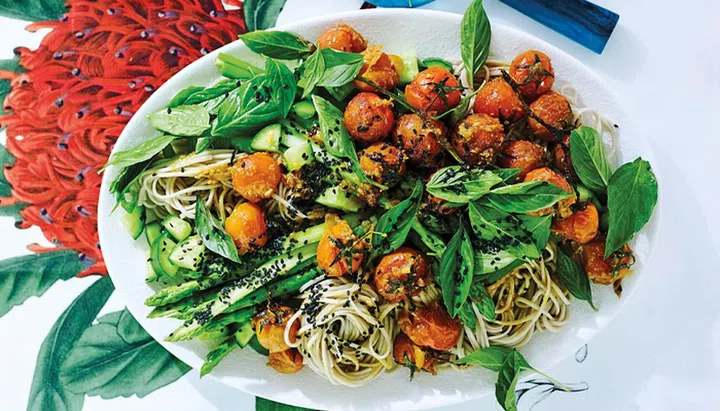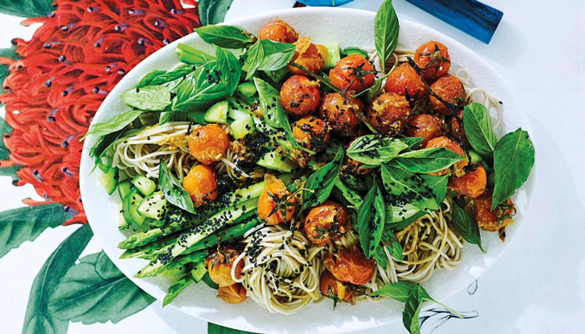 If you love tomatoes, this dish is packed with juicy ones! The Asian-style salad contains soba noodles to make the dish more substantial, you can adjust the quantity to make it a light meal or a full one.