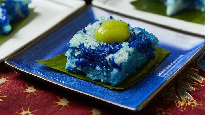 For dessert, why not serve up this simple but elegant Nyonya kueh? Made of glutinous rice steamed in coconut milk and pandan leaf, it can be eaten on its own or served with a bit of kaya for added flavour. Psst, the beautiful rich blue hue comes from butterfly pea flowers!