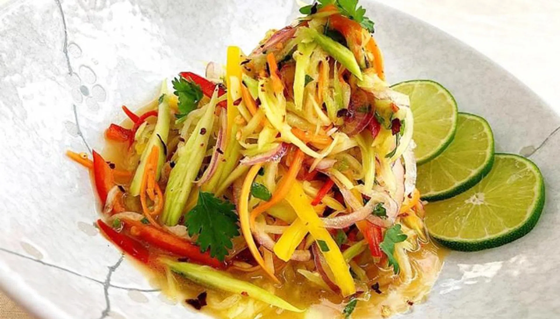 03. Place the chayote, green mango, carrot, yellow bell pepper, red bell pepper and onion in a bowl. Set aside while you prepare the salad dressing.