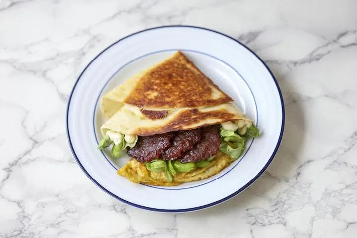 The lettuce cuts through the salt and oil from the bak kwa, while mozzarella gives a lovely melty cheese pull. Adding an omelette to the mix makes this a jazzed-up breakfast wrap - definitely several notches up from my school lunch box of yesteryear.