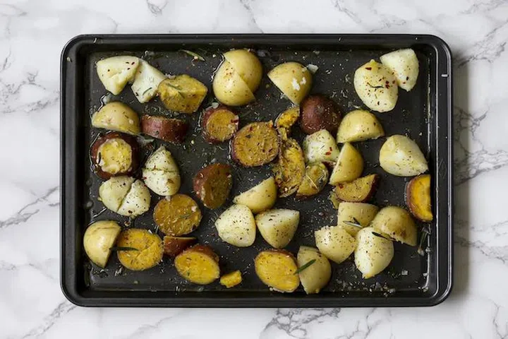 3. Drizzle olive oil and spread fresh herbs over a baking tray. When the potatoes are ready, drain from water and toss them in the herbs and oil. Ensure that each piece is coated in oil. Season with a teaspoon of salt.