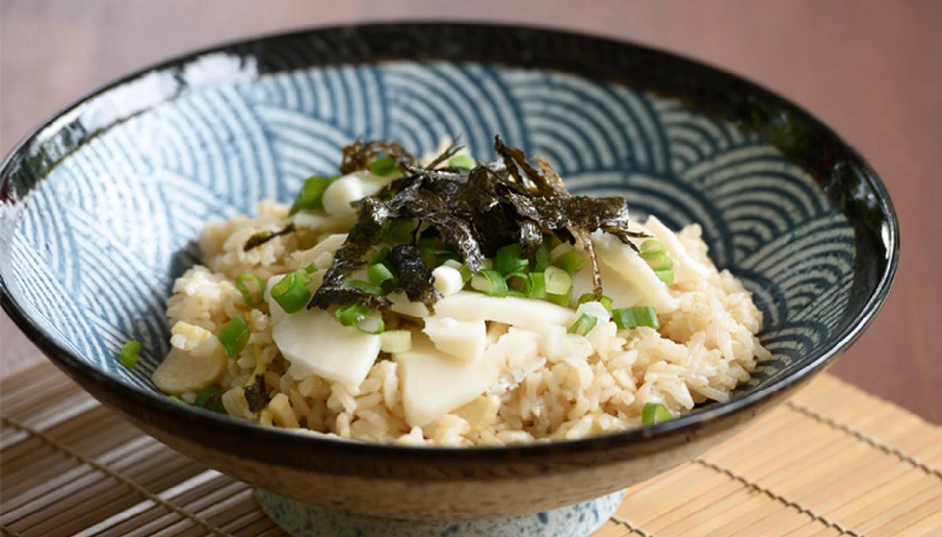 02. Place rice in rice cooker. Add dashi, soya sauce, sake, mirin, salt and pepper.