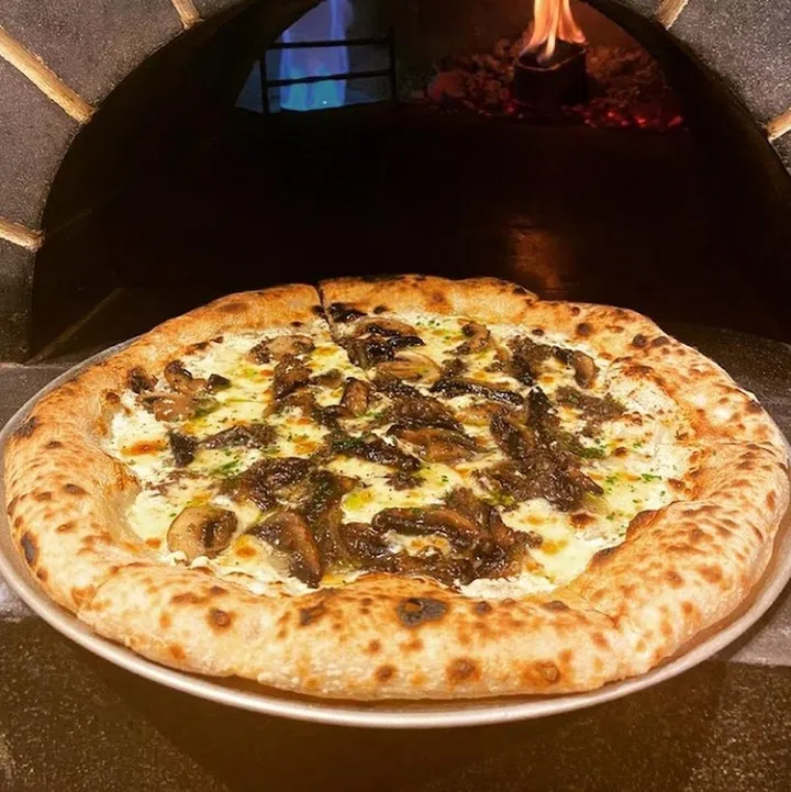 Pizzas here are made with handmade dough fermented for three days, topped off with numerous ingredients, then baked at 450 degrees with various types of firewood.