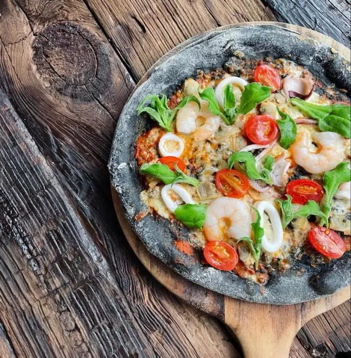 The Ika Sumi (pictured), which is Japanese squid ink pizza with ocean prawn, ika, asari, pesto arrabiata and ice plant. Also, the Unagi Pizza, consisting of smoked unagi, kebayaiki sauce, kebayaki mayo, shaved bonito flakes, spring onions and Japanese rayu.