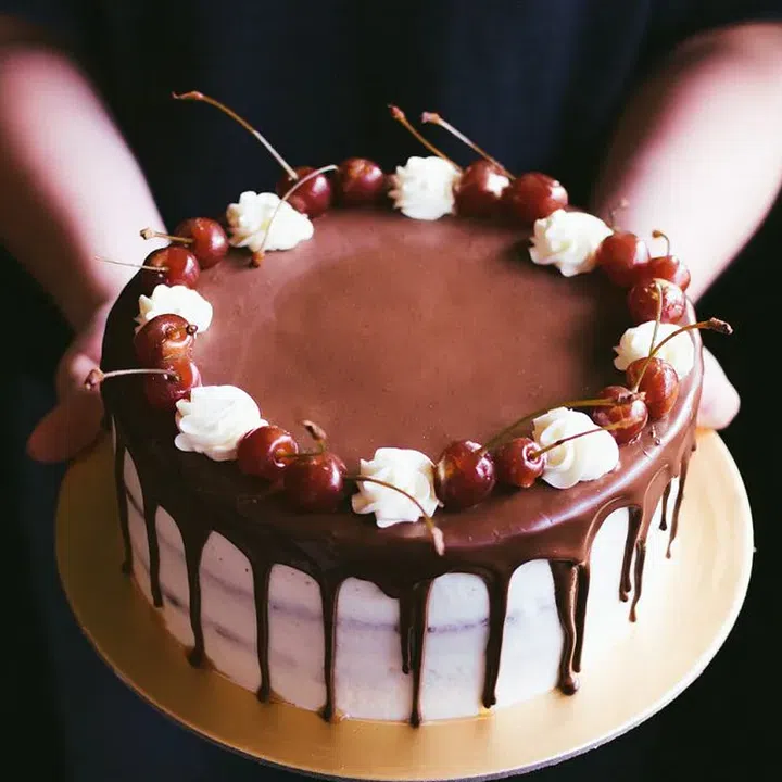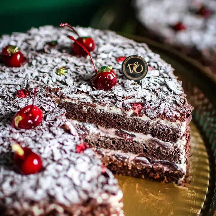 A classic version of the Black Forest gateau typically comprises multiple layers of chocolate sponge cake layered with whipped cream and foiled by cherry filling. It is then festooned with soft whipped cream, chocolate shavings and juicy kirsch soaked cherries on top.