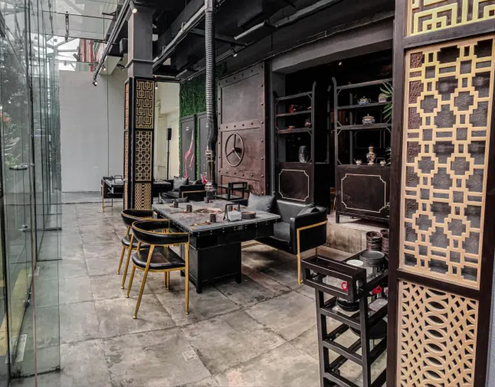 Inside, the interiors have a minimalist-meets-industrial chic aesthetic, with pops of gold as well as green thanks to lush potted plants.
