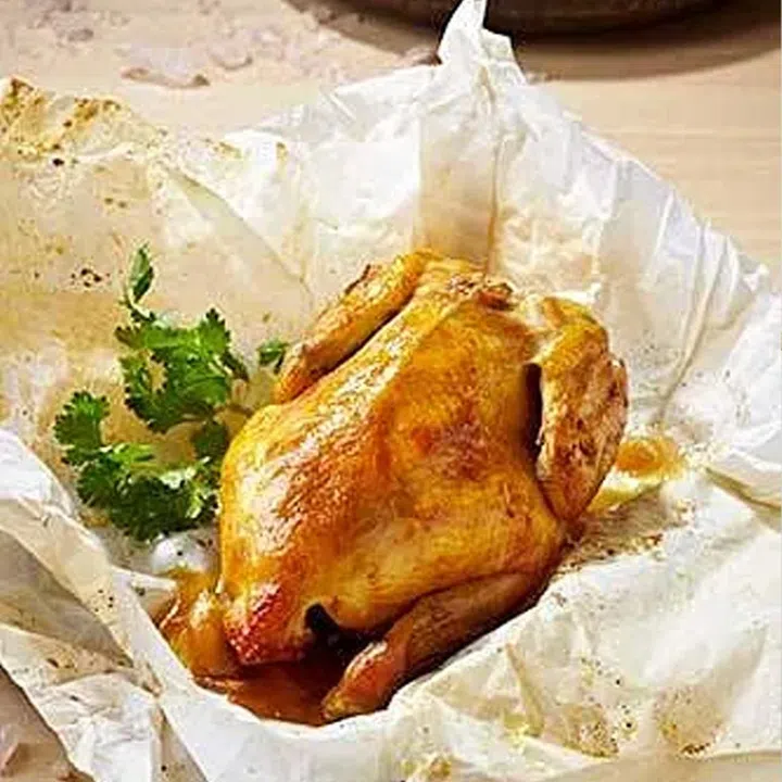 After the seasoned chicken is tightly wrapped in parchment paper, the parcel is covered with hot smoky salt and left to cook. This helps the moisture to be contained within during the cooking process – meaning the chicken is steamed in its own juices. What awaits is a flavourful and tender chicken when it is unwrapped.