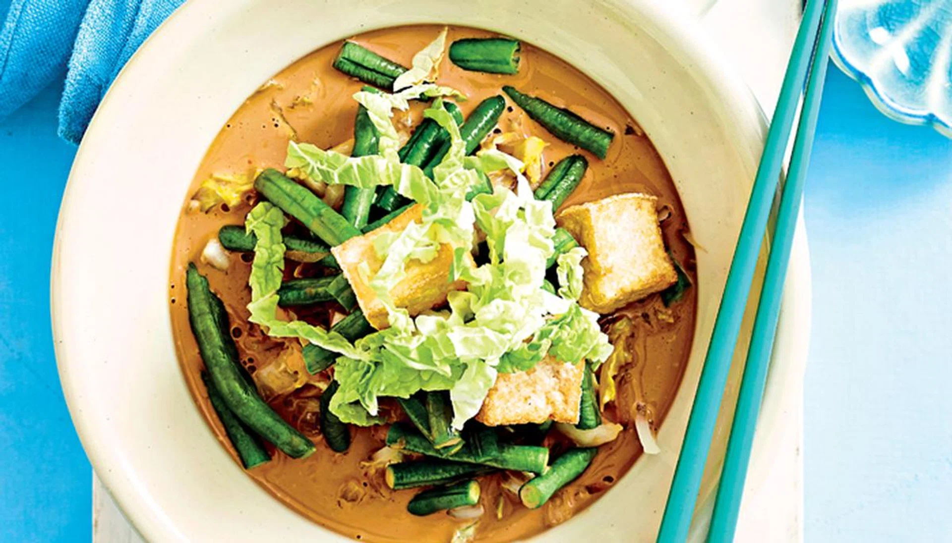 Golden brown tofu (beancurd) and tender wombok (Chinese cabbage) braised in coconut milk, dark soy sauce and fish sauce. Great for family meals.