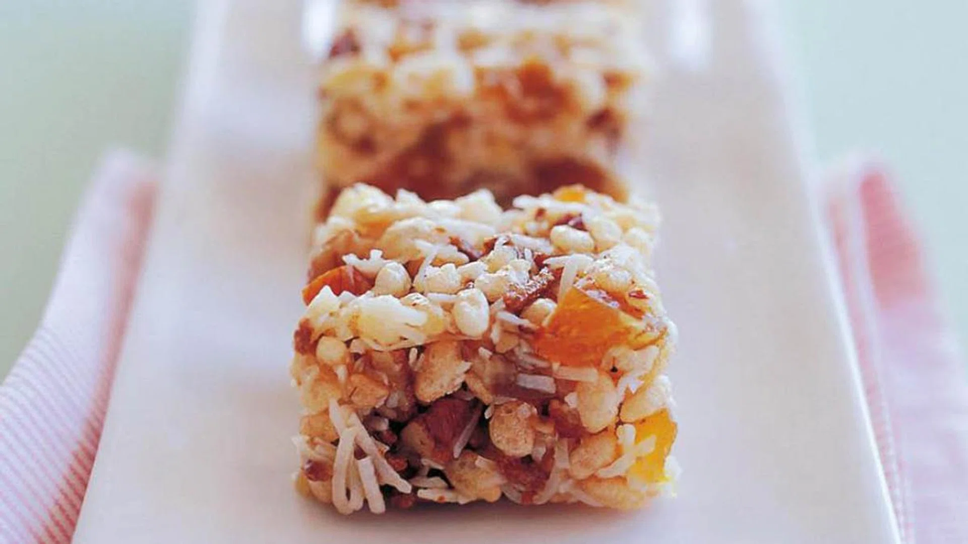 The party-favourite that is crisp and crunchy, this fruit coconut bubble slice contains shredded coconut, bran cereal, fruits and pecans.