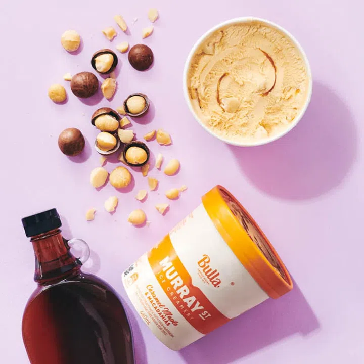 A velvety smooth caramel-flavoured ice cream with swirls of maple syrup and pieces of macadamia nuts.