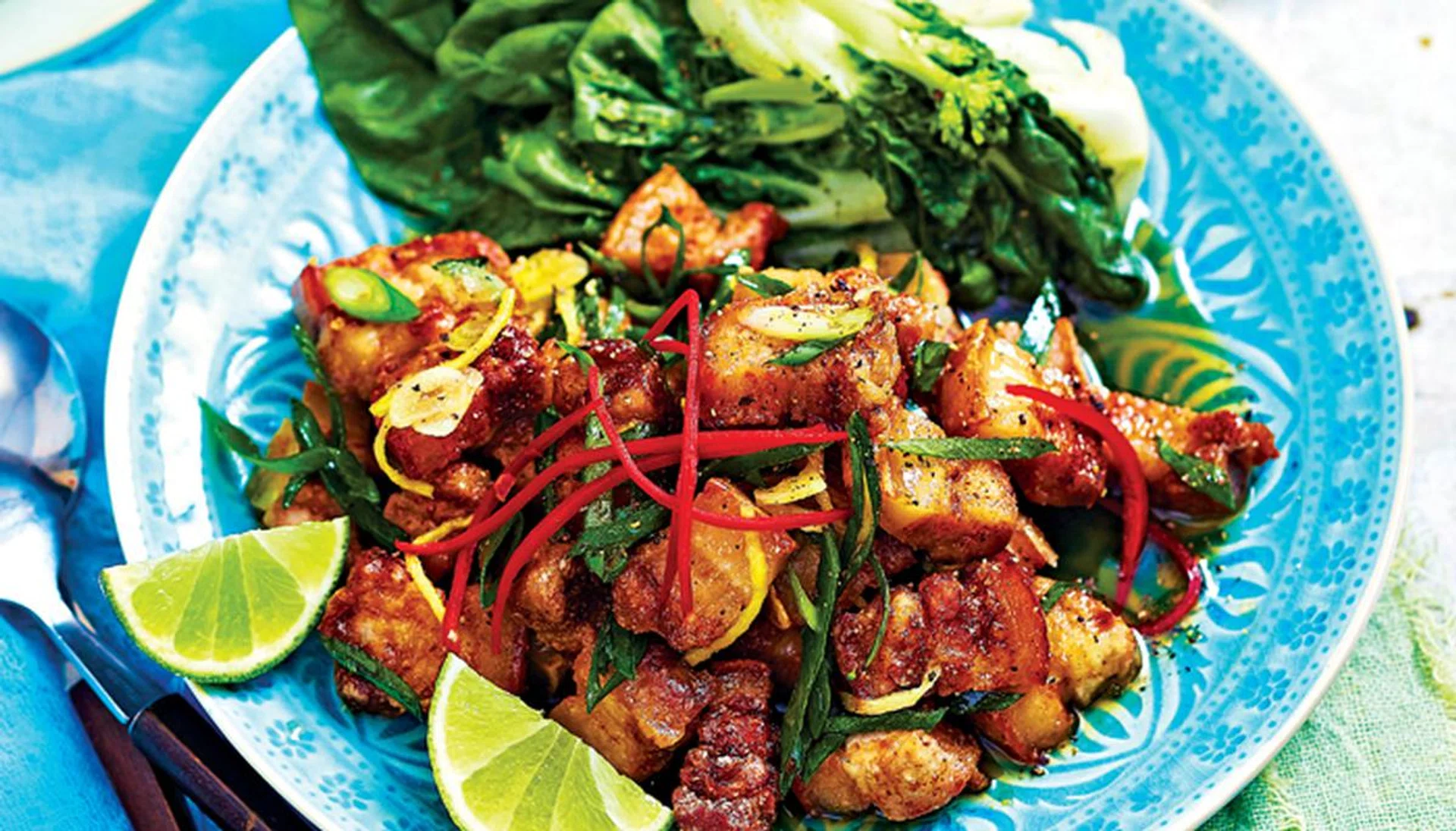 Pork fried in a caramel syrup, rice-wine vinegar and soy sauce mixture, served with steamed pak choy (Chinese cabbage) and chewy rice noodles.
