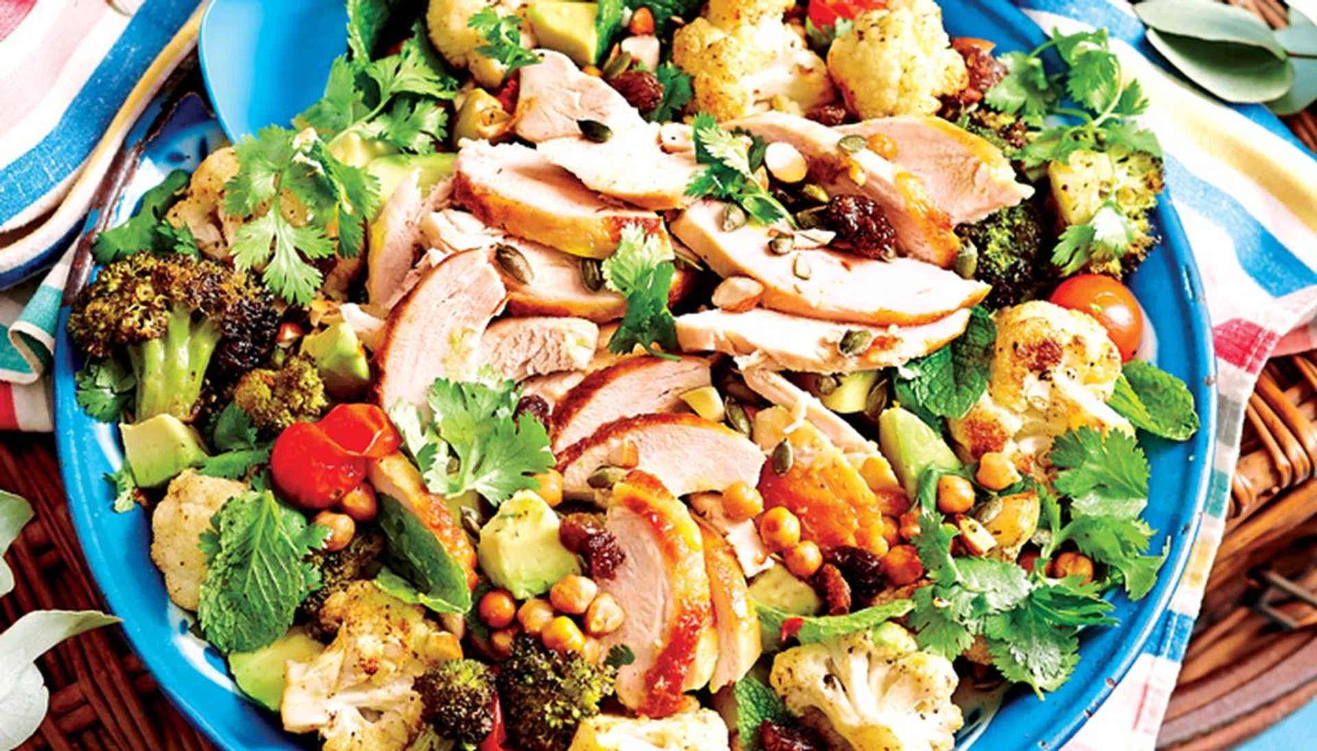 04. In a bowl, toss vegetable mixture with avocado, herbs, raisins, almonds and seeds. Serve topped with chicken and a drizzle of vinegar.