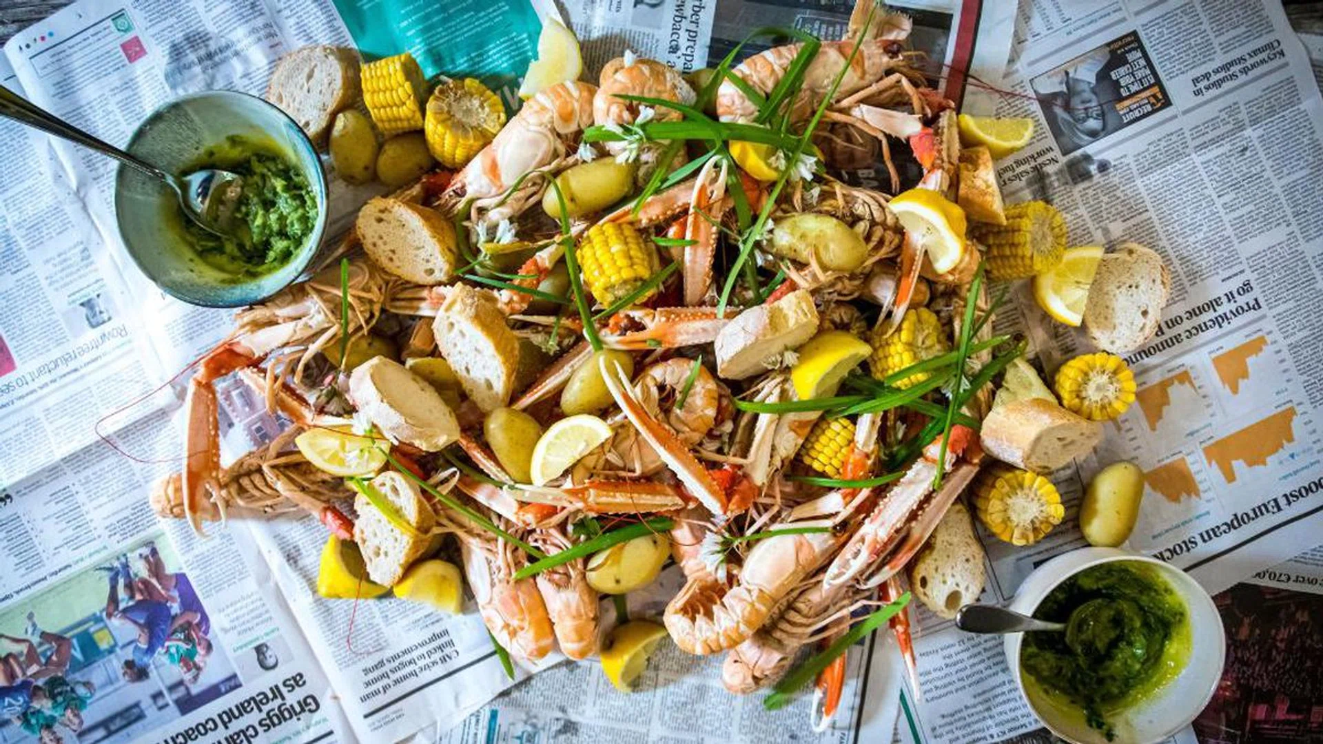 Imagine a bucket load of scampi splayed over your kitchen table for a hands-on seafood spread experience. That's what Donal Skehan's Dingle Bay prawn boil recipe, cooked within a brothy mix of potatoes, corn, carrots, and more entails – a classic, rich and delicious seafood boil, if not more.