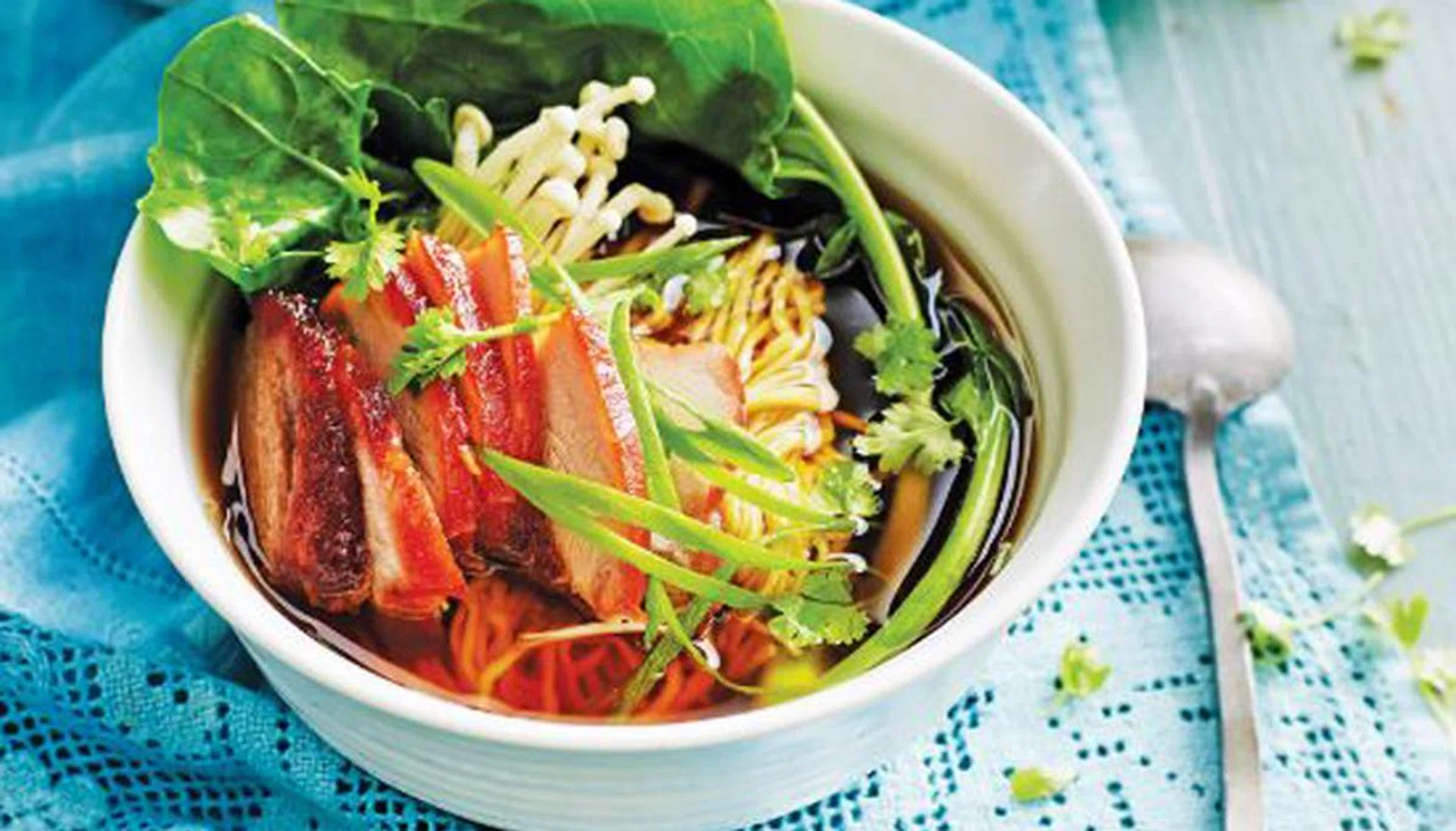 05. Spoon into four bowls. Top evenly with sliced pork and sprinkle extra onion over