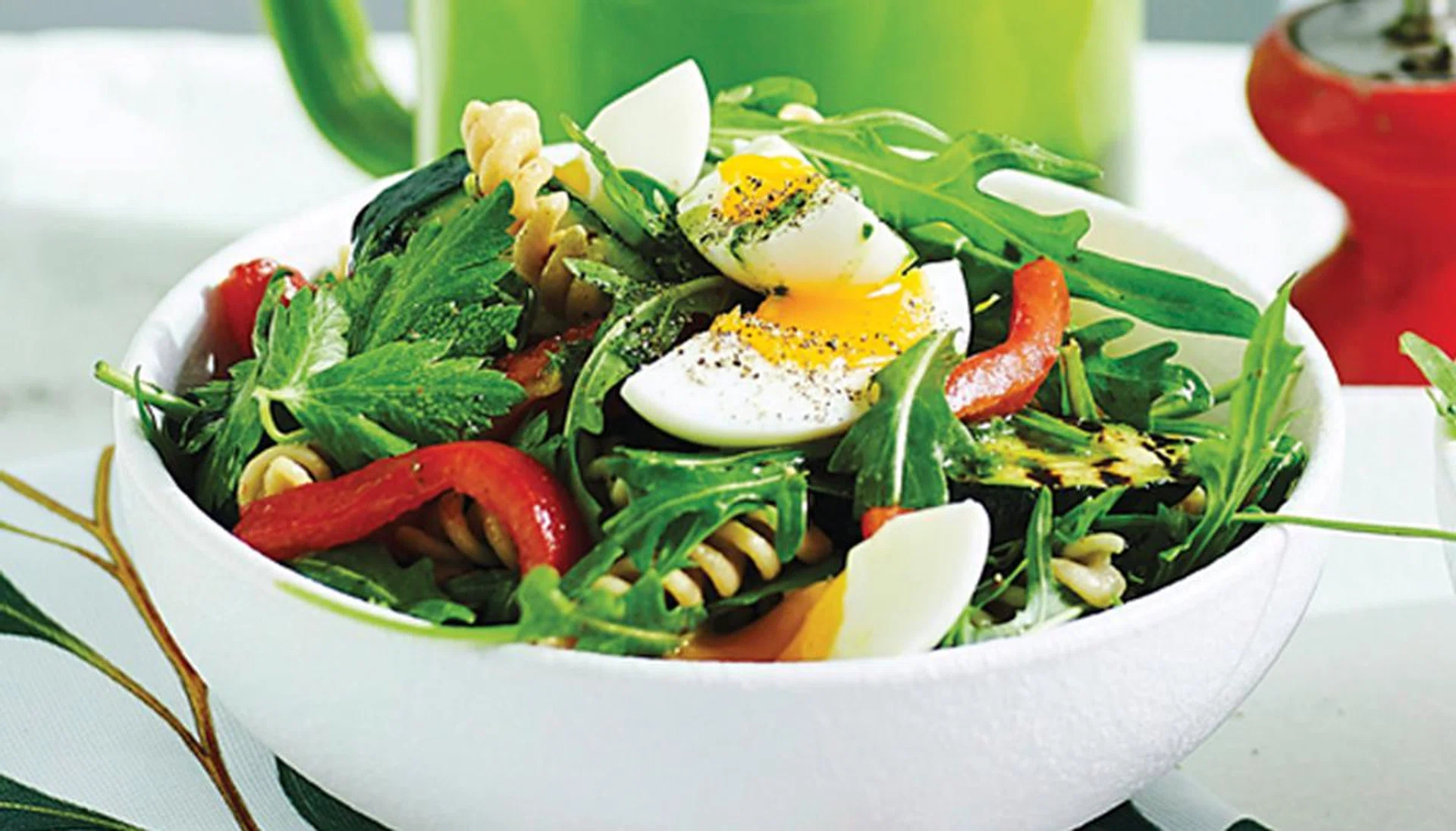This healthy salad has a crisp flavour thanks to the charred capsicums and zucchinis, with the addition of nutritious wholemeal spiral pasta and soft boiled eggs to fill you up.