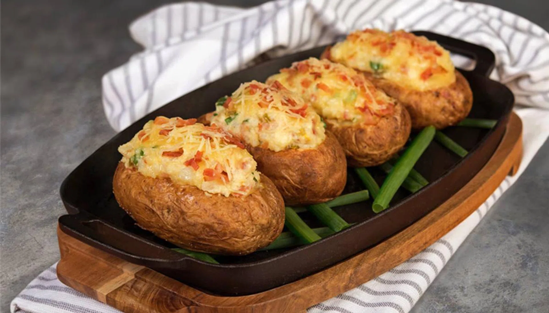 2 tbsps ghee ♥ 4 large russet potatoes (short, wide potatoes for stuffing) ♥ 1 tsp salt, divided ♥ ½ tsp black pepper to taste ♥ ½ cup sour cream ♥ 4 tbsps Organic Valley Cultured Unsalted Butter ♥ 2/3 cup Organic Valley Shredded Sharp Cheddar ♥ ¼ cup chopped mild jalapenos ♥ 1 tbsp of mild jalapeno vinegar brine from jar ♥ 1/3 cup chopped green onion ♥ ½ cup cooked bacon crumbles (set aside 3 tbsps for garnish) ♥ 1 egg yolk ♥ ¼ cup Organic Valley Shredded Sharp Cheddar