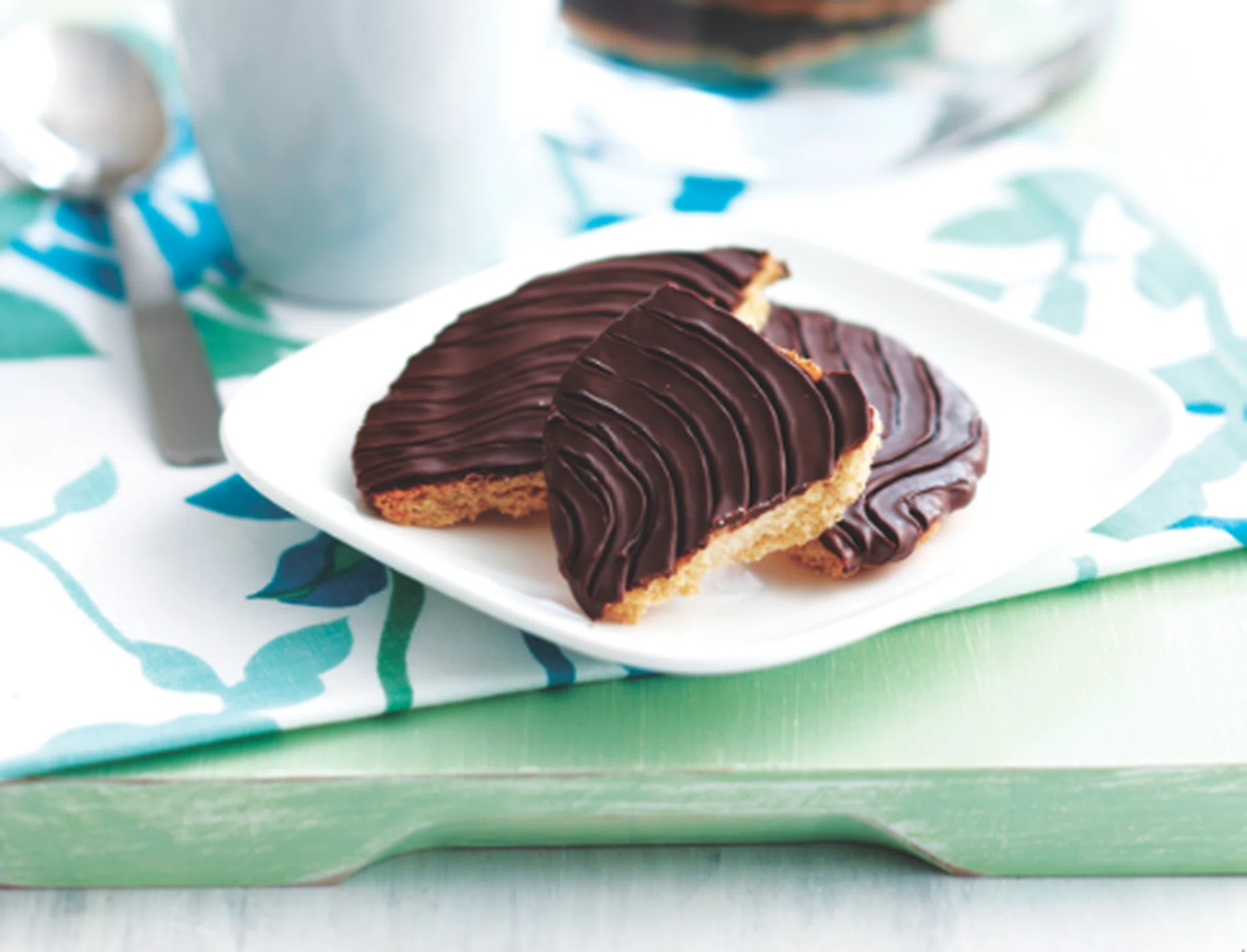 04. Dip flat bottom of each biscuit into chocolate. Create a rake pattern using a fork. Place on a wire rack and set aside until firm. Store in airtight containers.