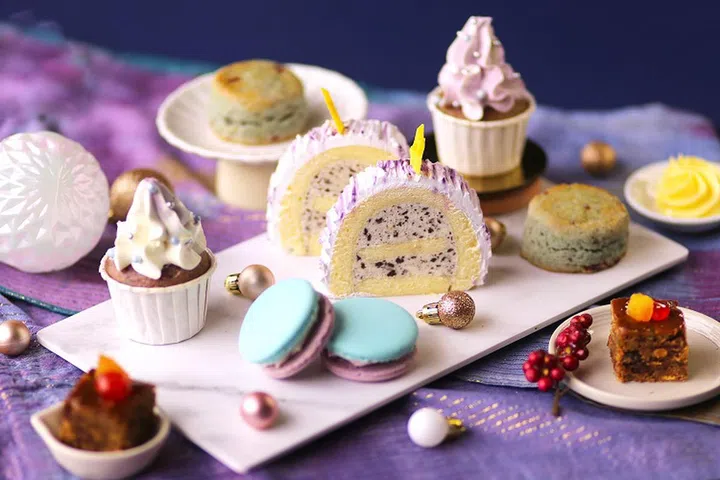 Doused in shades of midnight blue and lilac that nod to a starry night sky, the ‘Starry Tale’ Festive Afternoon Tea includes blue pea & cranberry scones, Oreo log cake slices, star-decorated cupcakes, classic fruit cake, and macarons.