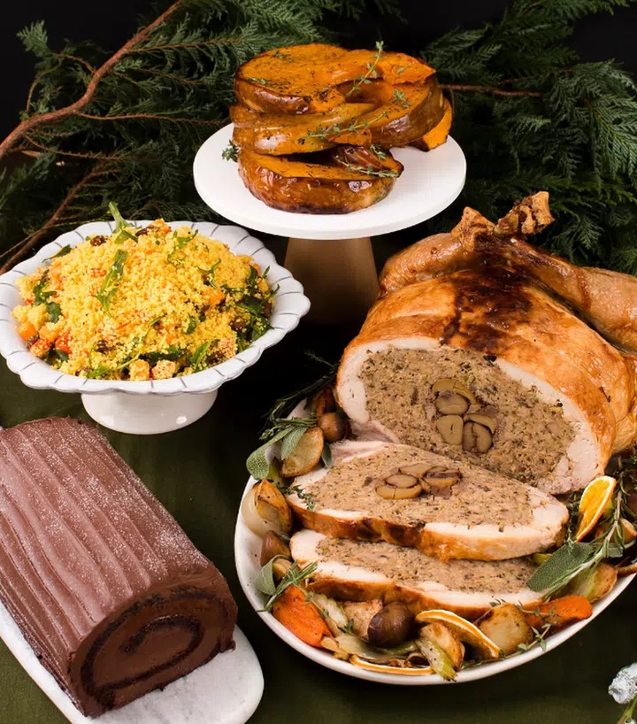 For fuss-free hosting, opt for the Christmas Roast Bundle (from $328) , designed for six to 12 guests. This gets you a choice of roast (turkey or chicken), roasted pumpkin, a couscous salad and a Flourless Valrhona Chocolate Log Cake (available for upgrade to other flavours at an additional cost).