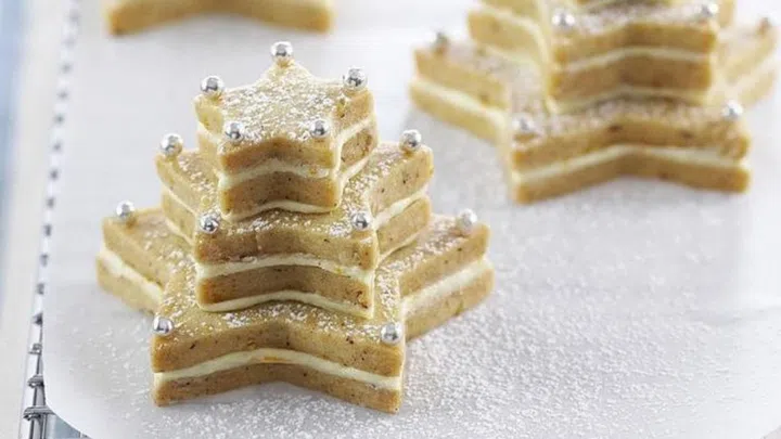 These cute little shortbread Christmas trees are perfect for desserts that can be finished in just a few bites. With the hazelnuts lending a nutty and toasted taste to the dessert, the buttery brandy cream between the shortbreads brings everything together.