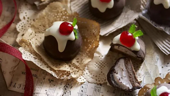 Now that we've got the main courses out the way, let's take a look at desserts. These chocolate cookies look amazing, but they're easy to make. It's a biscuit topped with a marshmallow, then covered in chocolate. Topped with red and green glace cherries, they look like mini Christmas pudding. If you want an Instagramable Christmas recipe, It doesn't get better than this.