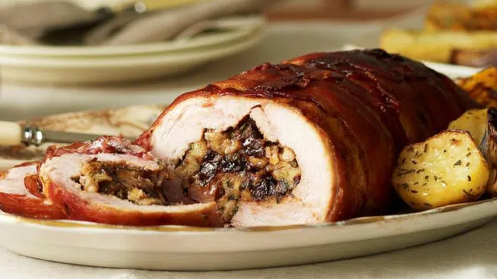 Moving on to the main courses, how about roasted turkey meat filled with pear, prune, and walnut stuffing? Easier and healthier than the traditional stuffed turkey dish, it also takes less time, which is a plus when you're hosting a whole party.