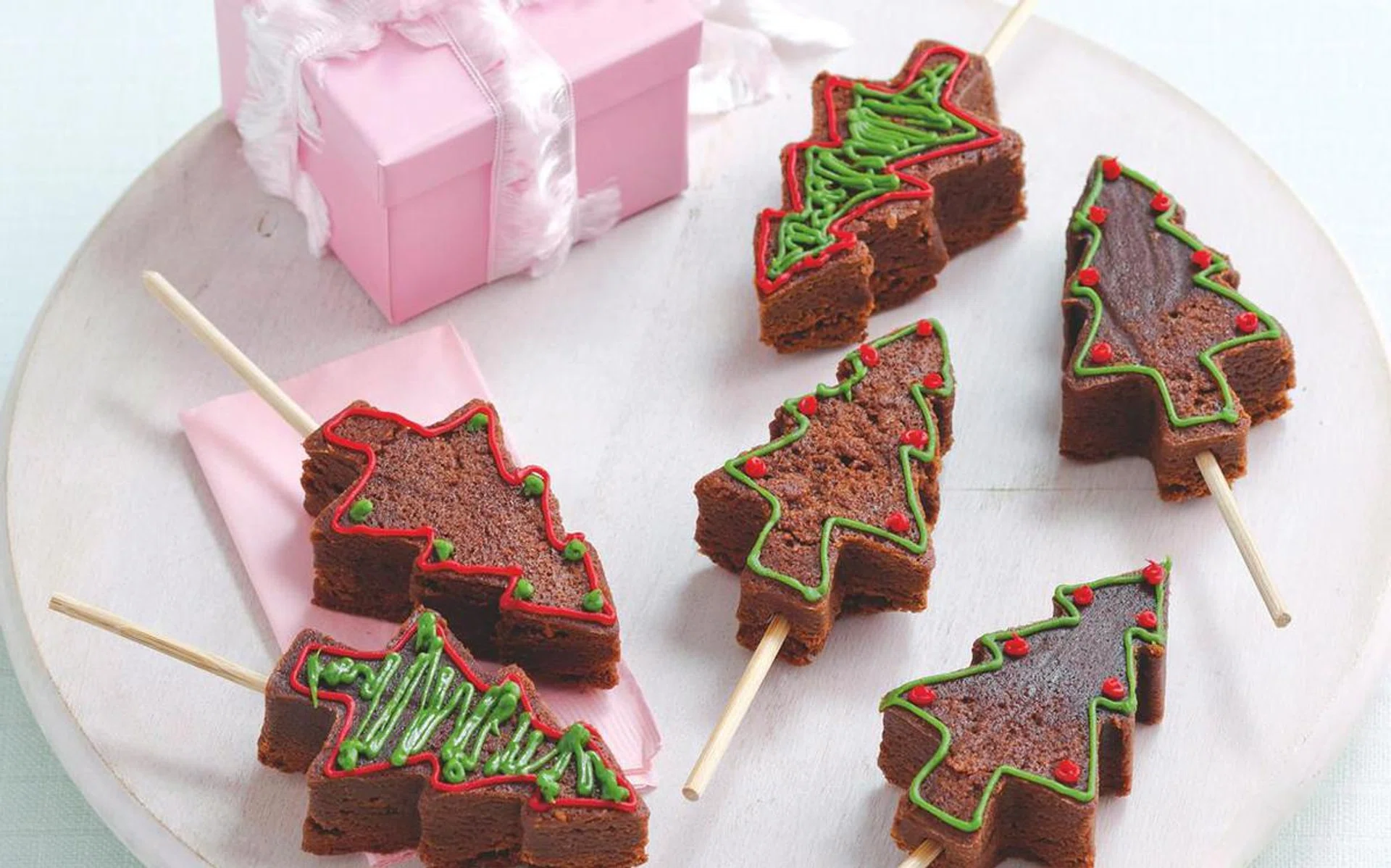 03. Transfer brownie to a chopping board. [KIDS: Using an 8 cm Christmas tree-shaped cookie cutter, cut out 16 shapes from brownie.] Insert a wooden skewer into base of each tree. [KIDS: Decorate tops with red and green decorating icing.] Set.