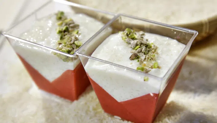 Surprise everyone at the end of the meal with this fusion dessert of a tangy strawberry panna cotta topped with fragrant rice pudding. Recipe by Allspice Institute for The Weekly's Domestic Diva Cooking Masterclass.