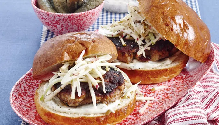 Salmon makes a great burger! Here, Norwegian chef and restaurateur Chef Geir Skeie transforms a fillet of salmon into a juicy burger, and added some real American BBQ sauce and a fresh home made coleslaw to complete the magic. Delicious with baked potatoes and a crispy green salad!