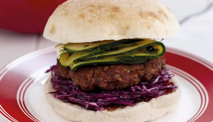 With its flavourful patty of peas and beans, sweet roasted pumpkin and melted haloumi, this vegetarian burger makes a hearty, nutritious meal.