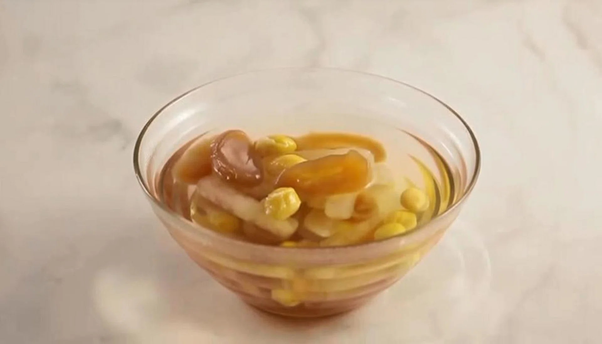 01. Place water, fresh gingko nuts, sea coconut and candied melon into a pot and bring to boil.