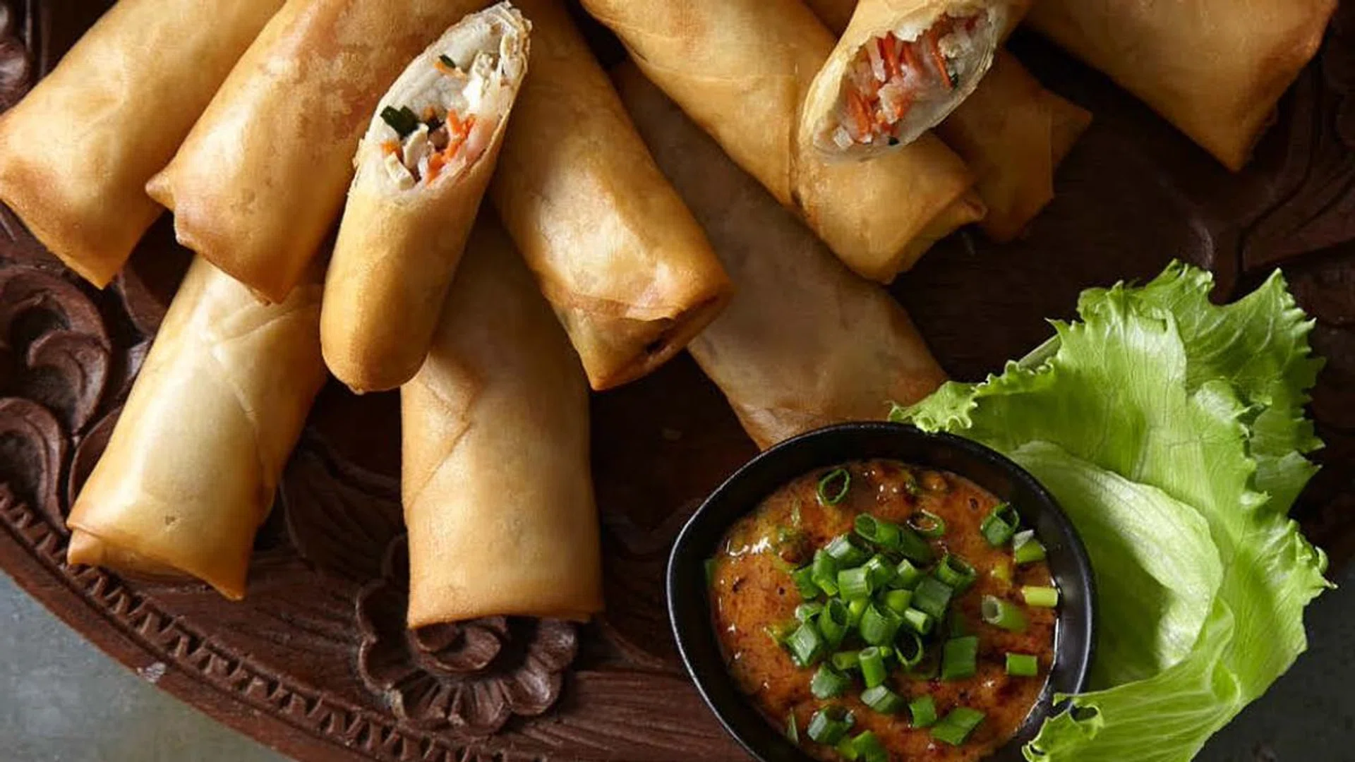 04. Deep fry spring rolls in hot oil around 4 mins or until crispy and lightly golden. Drain off excess oil on paper towel. Serve with peanut dip.