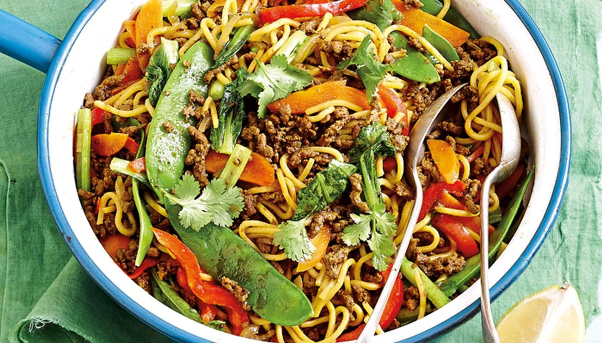 04. Add stock, snow peas, carrots and capsicum to mince. Bring to boil. Reduce heat to low and simmer 3 to 5 mins until vegetables are tender. Stir noodles and choy sum through. Simmer a further 1 min until heated through.