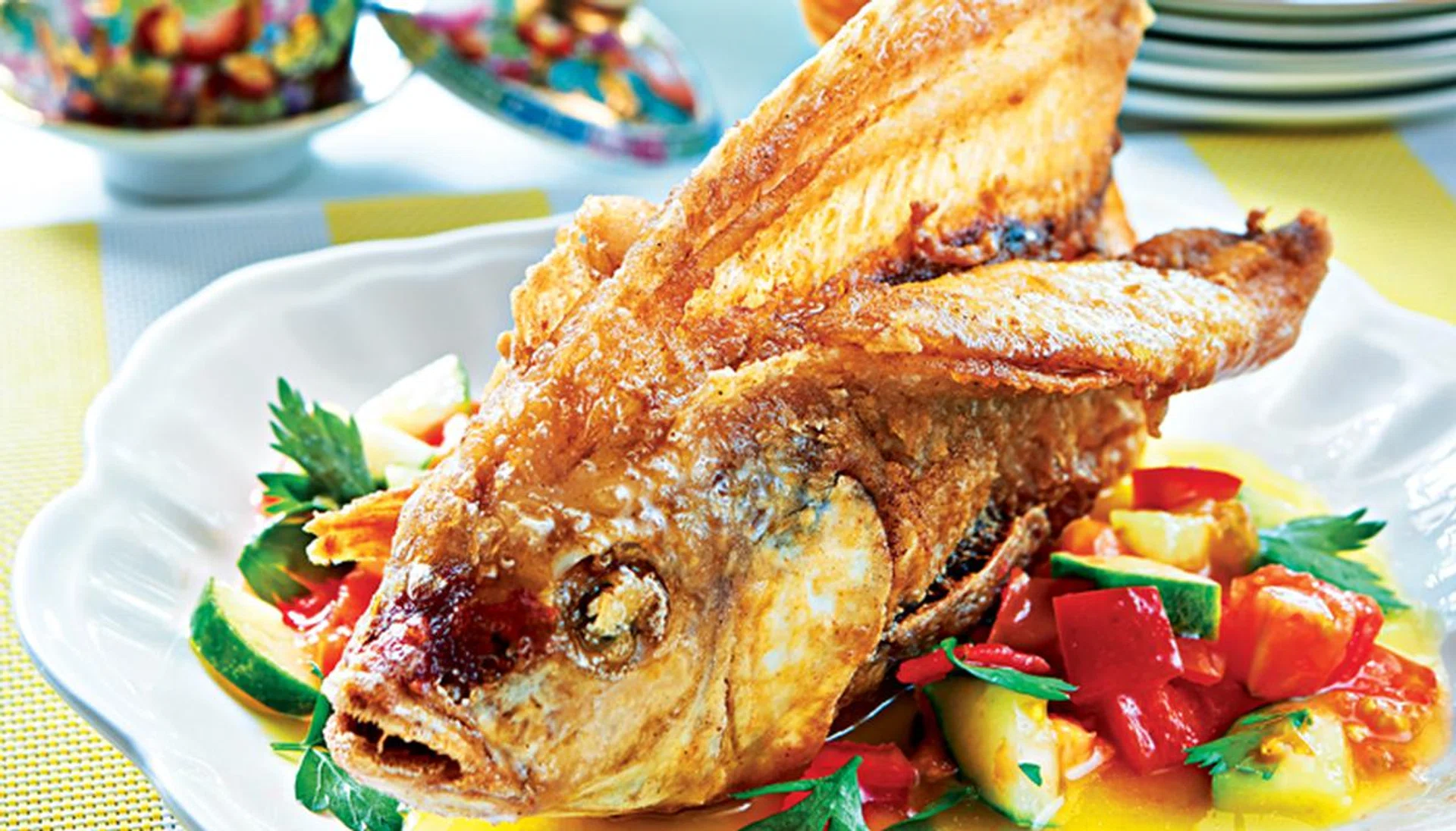 01. To prepare fish: Scale fish but do not slit fish belly to remove innards. Remove gills, then only remove innards from the gills’ opening. Place fish flat on a cutting board. Using a sharp knife, slice from the top fin from the head into the main bone towards the tail; do not cut into the stomach. Do the same for the other side. Rub salt all over fish and set aside.