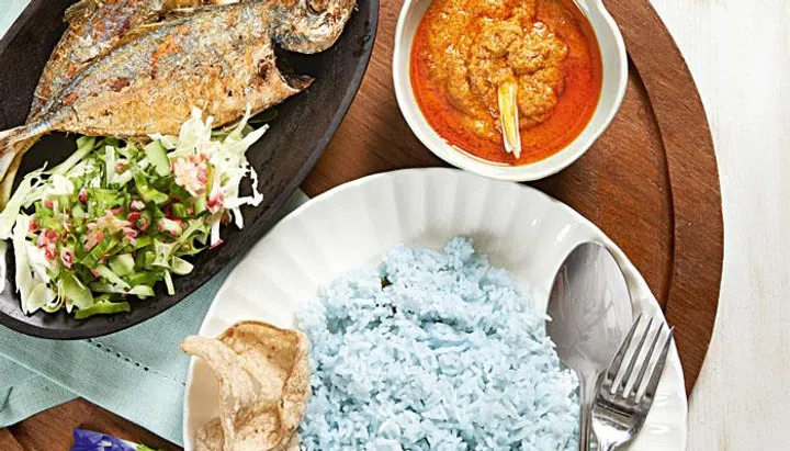 A typical Malay dish, nasi kerabu comprises exotic blue rice with fried fish and vegetables, accompanied by sambal coconut.