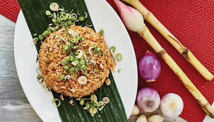 A typical Malay dish, nasi kerabu is exotic blue rice with fried fish and vegetables, accompanied by sambal coconut.