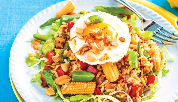 A traditional family favourite, nasi goreng is a stunning Indonesian fried rice dish brimming with fresh vegetables and a fried egg on top!