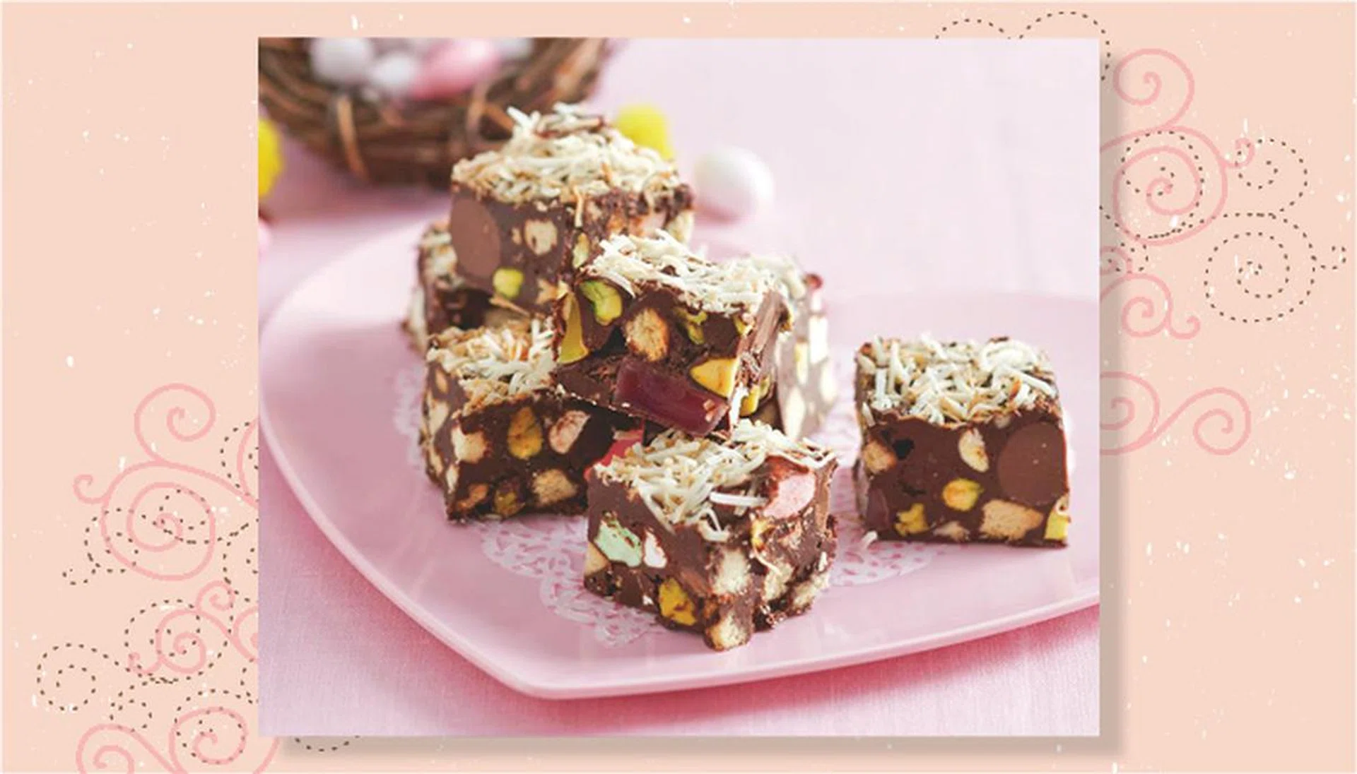 02. Add pistachio, chocolate eggs, marshmallows, biscuit and Turkish delight; stir gently to combine. Transfer to prepared pan. Gently press down to compress mixture; level surface. Sprinkle top with coconut; press into chocolate mixture. Chill for 2 hours or until set.