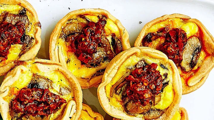 A vegeterian, meat-free mini quiche recipe using mushroom, garlic and tomato that reminds you of tangy pasta but in buttery crust.