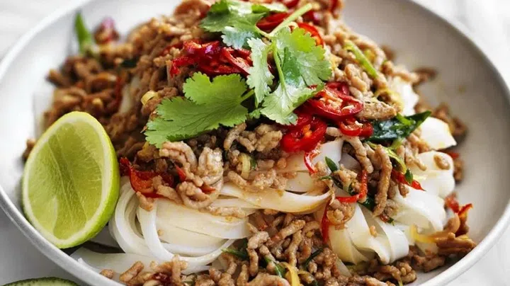 You can take a break from weeknight dinner takeaways by preparing your own, starting with this quick and easy pork and kway teow dish. The mixture of minced pork, lemongrass, garlic and sambal oelek make for a fragrant base for the dish, to be conveniently soaked up by springy rice noodles.